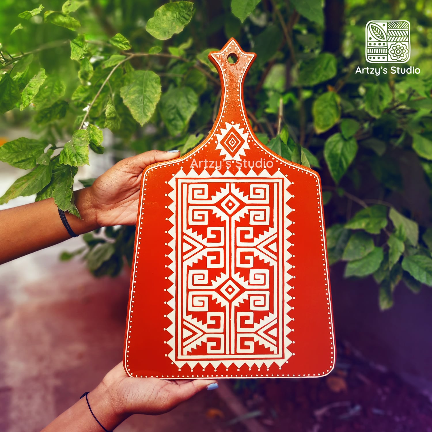 Crafted with a beautiful white pattern African art, this chopper board is a perfect addition to any kitchen. Its durable material ensures long-term use, while the unique design adds an aesthetic touch to food preparation. Enhance your cooking experience with this functional and stylish chopper board.