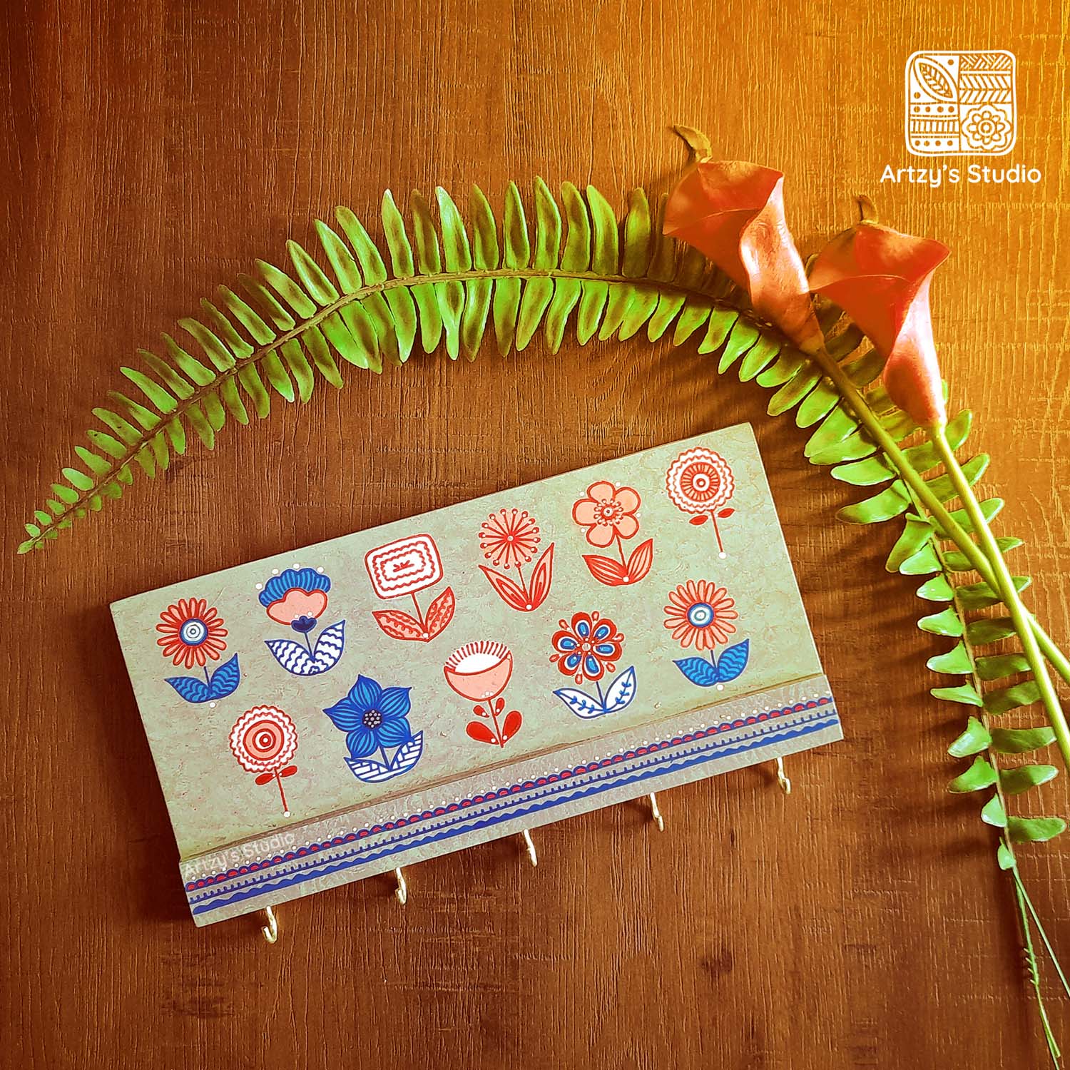 This key holder features a beautiful floral design and five hooks to keep your keys organized and easily accessible. The off-white background adds a touch of elegance to any space. Keep your keys in one place with this functional and stylish key holder.